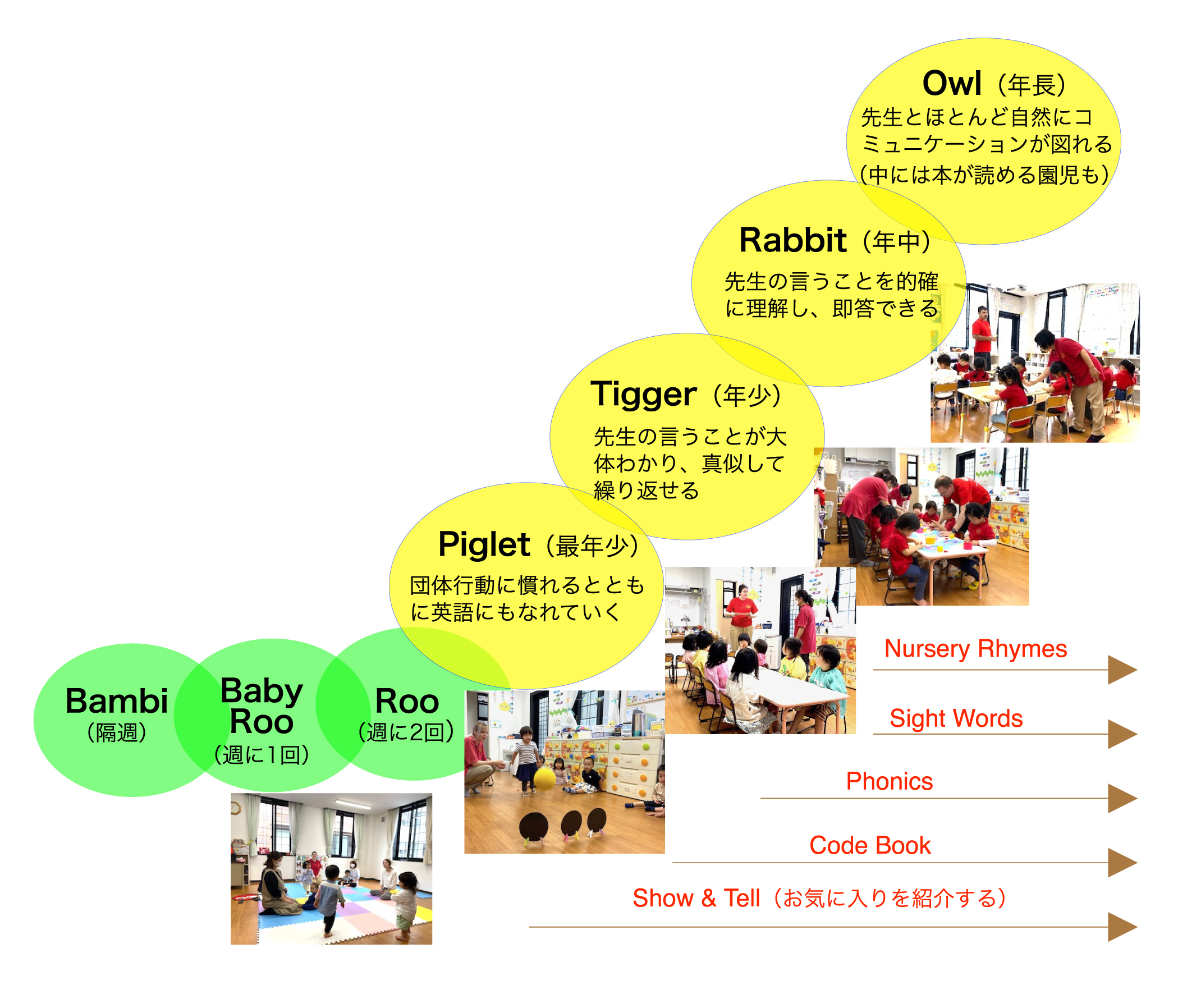 英語を教えるのでなく、英語100%課境の中で「異年齢との交流も多く取り込みながら、自然に英語を覚えていく」ことができます。