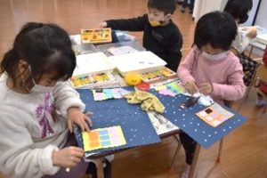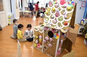今年のテーマは“Winter&Christmas”、雪の中で遊ぶ自分の姿をイメージして貼り絵をしたり、ヘンゼルとグレーテルのお話に出てくるようなお菓子の家(Gingerbread House)を段ボールで作って遊んだり、Jingle Bellを作って、Jingle Bellsの歌を手話も添えて歌ったり、雪合戦、スノードームを作ったりと濃い内容です。