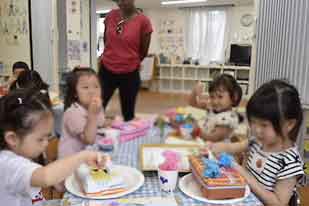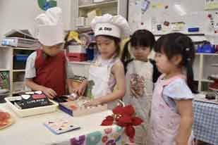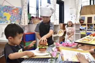 Big kidsが作ったエッグプレートをメイン・ディッシュに、今日だけのHKレストランがオープンしました。シェフとお客さんに分かれ、シェフはエプロンを付けてシェフ・ハットを被り、本物になった気分♪