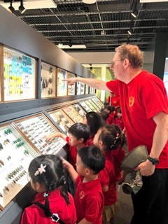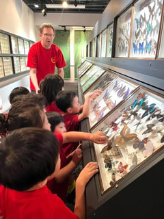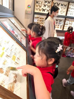 蝶のコーナーでは、綺麗なブルー、オレンジ、レインボーカラーの蝶を子ども達は不思議そうに見ていて”Is this real?”と教師に聞く子もいました。