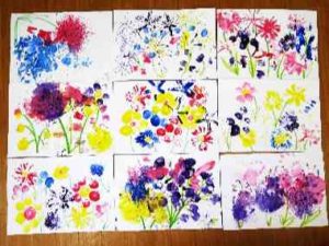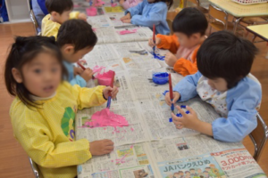 画用紙に絵の具を少しのせて息をふきかけて木の幹や枝を描き(吹き絵)フィンガーペインティングで花を描き、桜を完成させました。