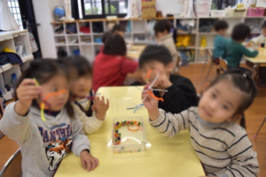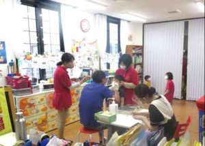 保育時間が終わってもお店屋さんごっこは続きます。降園前の小さいクラスの子どもたちもお買い物に参戦。HKMoneyを握りしめ、何を買おうかしっかりと品定めしていました。