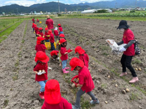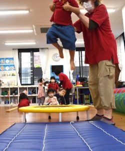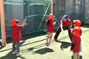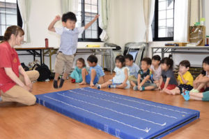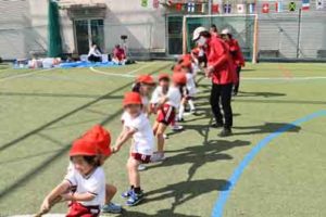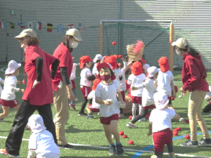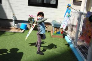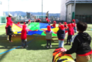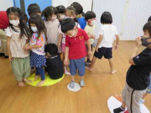 年長さんがパラシュートの周りに立って、小さなクラスの子達が上手くその下をくぐり抜けられるように、しっかりとパラシュートのはしを持ってくれていたので、無事に障害物を乗り越えて、成功することが出来ました。