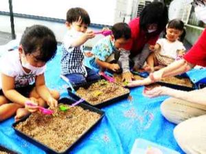子どもたちが待ちに待ったお店屋さんごっこです。あらかじめ自分たちで作ったお金や食べ物、HKのおもちゃを使って、大きいクラスの子どもたちがお店の人とお客さんに分かれてはじまりはじまり。おだいはお金の色と揃えて小さいクラスの子どもたちでもわかるようにしました。