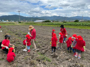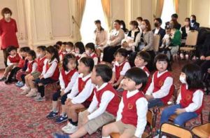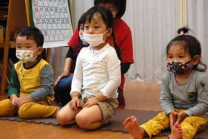 コロナ禍の前は萬翠荘で行っていた入園式を今年も残念ですが、感染回避対策を考慮しながら当園で実施しました。入園、進級した子どもたち、クラス毎の紹介の後、みんなが大好きな歌“Skinamarik”を合唱し、記念撮影を撮りました。