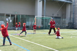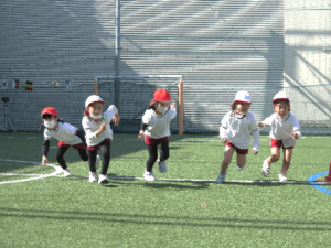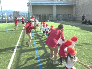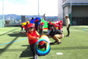 寒さに負けず広いフットサル場を思い切り走り回ったり、サッカーボールを蹴ったり、フラフープを転がして追いかけたりして、自由にのびのびと遊びました。その後、障害物競争に挑戦しました。