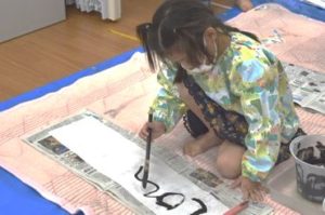 左手を右肩から振り下ろす打ち方がなかなか理解できず何度も練習してみました。最後には掛け声を入れて一生懸命でした。