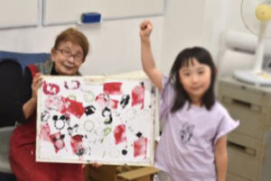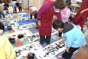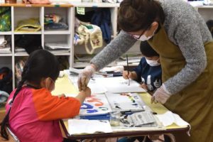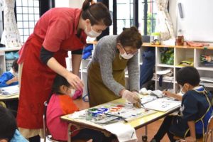 4色の色の顔料を塗って描くのですが濃淡の調整が難しく、どうしても淡くなってしまいます。まず顔料をしっかり混ぜて濃く表現したいところは2度塗りするなどしながら丁寧に気を付けて描いていました。 大好きなフルーツや花をモチーフに描いたり、文字や模様を組み合わせて一色で描いている子もいて、楽しそうに筆を動かしている中、お皿の大部分を一色に塗っている子がいたので心配して声を掛けたところ、筆を止めて少し考えた後、残りの部分を他の色で点や線をカラフルに描いてとても個性的で素敵な作品に仕上げていました。 子ども達の創造力や表現力にはいつもビックリさせられます。