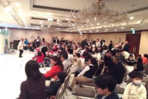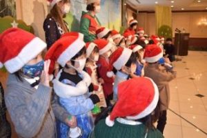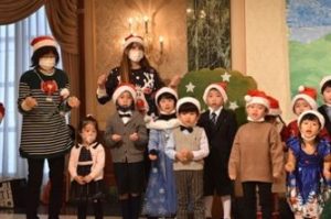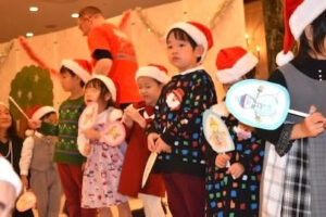 2025年12月14日、ANAクラウンプラザホテルにて Christmas Party を開催しました。 今年もANAクラウンプラザホテルにてクリスマスパーティーを開催。 まずOwl(年長)クラス、Rabbit(年中)クラスによる美しいハンドベルの音色でパーティーがスタートし、元気いっぱいの”We Wish a Merry Christmas”の歌声が会場に響き渡りました。