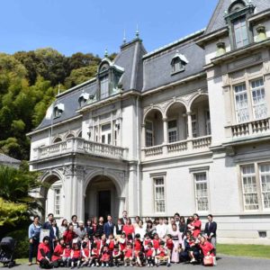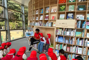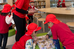 係りの方もとても親切で、色々と本の種類や場所を教えていただき、全員で図書館を探索です。 しばらくすると、子供が目を輝かせて「秘密の基地を見つけた!」と言いに来ました。なるほど、曲線の本棚の間に数名が座る場所があり、ちょうど隠れ家みたいですね。とにかくガラス張りなので明るい、清潔、本を見やすい、寝転んでも読める。窓からは入園式で使用させていただく「萬翠荘」も目の前。 最後にAriel先生が、3冊の本を読んでくれました。英語の本、英語と日本語の本、最後は日本語の本でみんなで英語で説明してあげました。近いのでまた歩いて行きましょうね。