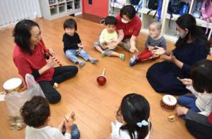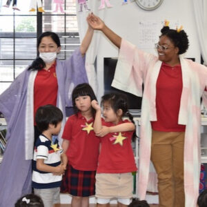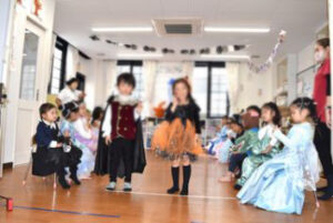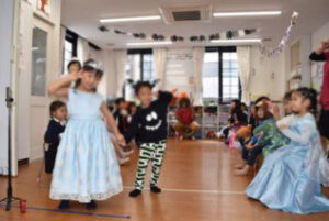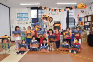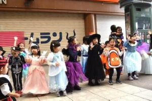 October 30 (Thu) Halloween Party & 31 (Fri) Halloween Parade Inside the school, the atmosphere was filled with spooky excitement — glowing Jack-o’-lanterns carved together with Ariel and Ade were on display! (Actually, the children named them “Mr. Orange” and “Mr. Heart.” Aren’t their eyes adorable?) On Thursday the 30th, our Halloween Party began! The children came to school in colorful costumes, and the whole place turned into Halloween mode. Maria appeared as a “Kyonshee” (Chinese hopping vampire)! We started with Halloween songs, and everyone’s favorite part was shouting “Boo!!” during “Five Little Ghosts.” After that, the kids were divided into groups to enjoy Halloween activities such as the Haunted House, Halloween games, and making ghosts out of playdough. On Friday the 31st, it was unfortunately a rainy day, but we hopped on the school bus and headed to Okaido! First, the children sang the “Hello Song” that they always sing at school. Next, they performed “♪Five Little Ghosts” again, feeling just like real little ghosts! At the next stop, they sang “♪Knock Knock, Trick or Treat” while acting as witches, cats, werewolves, pirates, and many other characters. At the entrance of Okaido, they danced cheerfully to “♪Hot Potato” and finished with a group photo. Even in the rain, many parents came to watch and enjoy their children’s adorable performances. Thank you very much. It was a lively and unforgettable Halloween week filled with smiles and laughter.