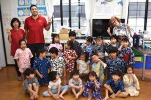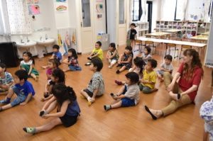 英語だけの世界で遊びや学習をしていますが、 今回、例年のように天野先生に来ていただき「和太鼓」を勉強しました。