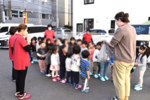 いよいよ消防署へ到着!消防署には大きくてカッコいい車両が沢山あり、子ども達はワクワクした表情で待ちきれない様子でした。消防署にある「はしご車」「ポンプ車」「救護車」など、さまざまな種類の車両を見せていただきました。