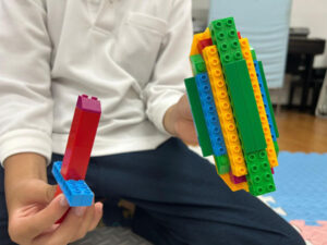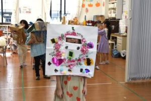 積み重ねて高く高く飾っていくという単純な活動ですが、その中で子どもたちは素材を上手に使いカラフルでおいしそうなパフェを作ることができました。出来上がった後、先生の声掛けで“お店屋さんごっこ”が始まりました。