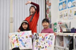 目はどんな感じ(Big eyes? Scaryeyes?)?虎みたいなパンツを履いてる?(Is he wearing Tigerpants?)など、子どもたちからは色んな英語が飛び交いながら、 楽しく描いていきました。ユニークな鬼の絵が出来上がりました!!